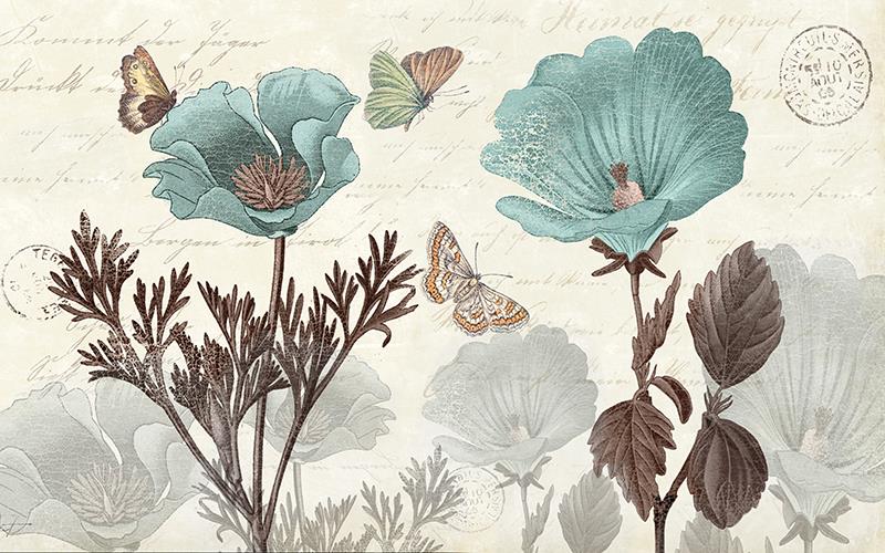 گلهای پنج پر یاسی و پروانه ها با زمینه قوها در آب