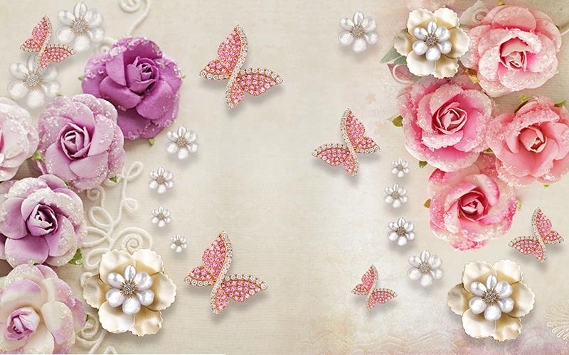 گلهای رز صورتی و یاسی با پروانه نگین دار