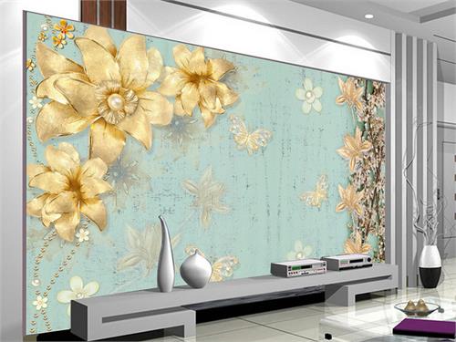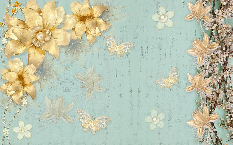گلهای طلایی و درخت شکوفه دار با زمینه پروانه ها