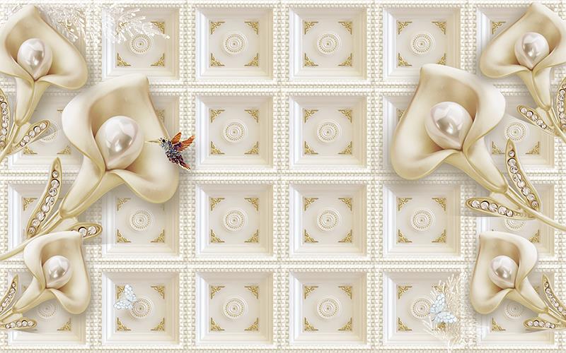 گلهای شیپوری با برگهای نگین دار و زمینه گچبری مربعی