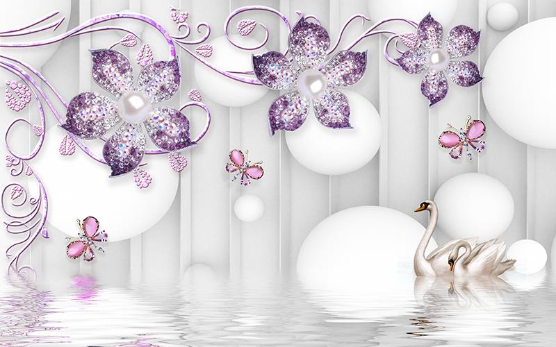 گلهای پنج پر یاسی و پروانه ها با زمینه قوها در آب