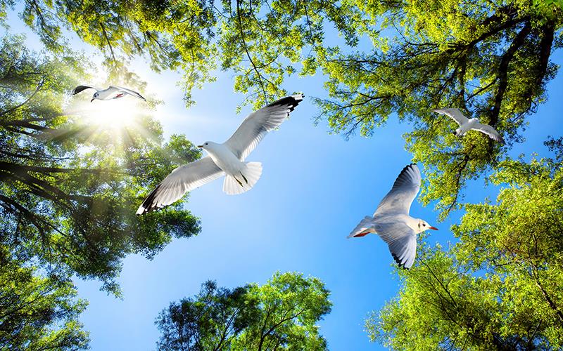 مرغان دریایی در حال پرواز با زمینه درختان و آسمان