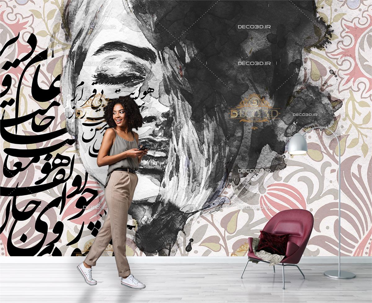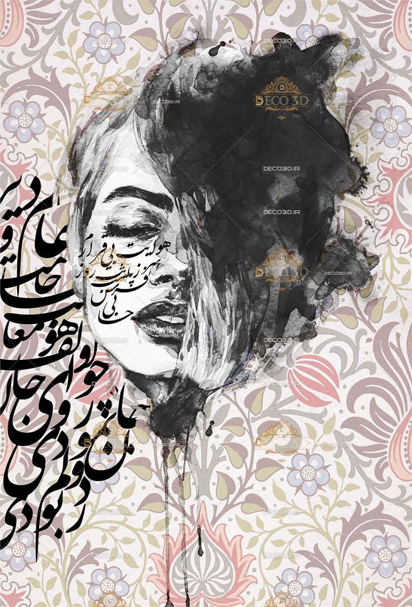 کالیگرافی با خط شکسته نستعلیق و همراه باچهره زن با آب مرکب