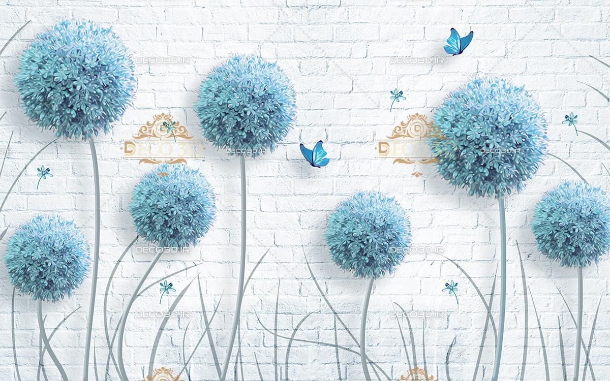 قاصدک ها و پروانه های آبی با زمینه دیوار آجری