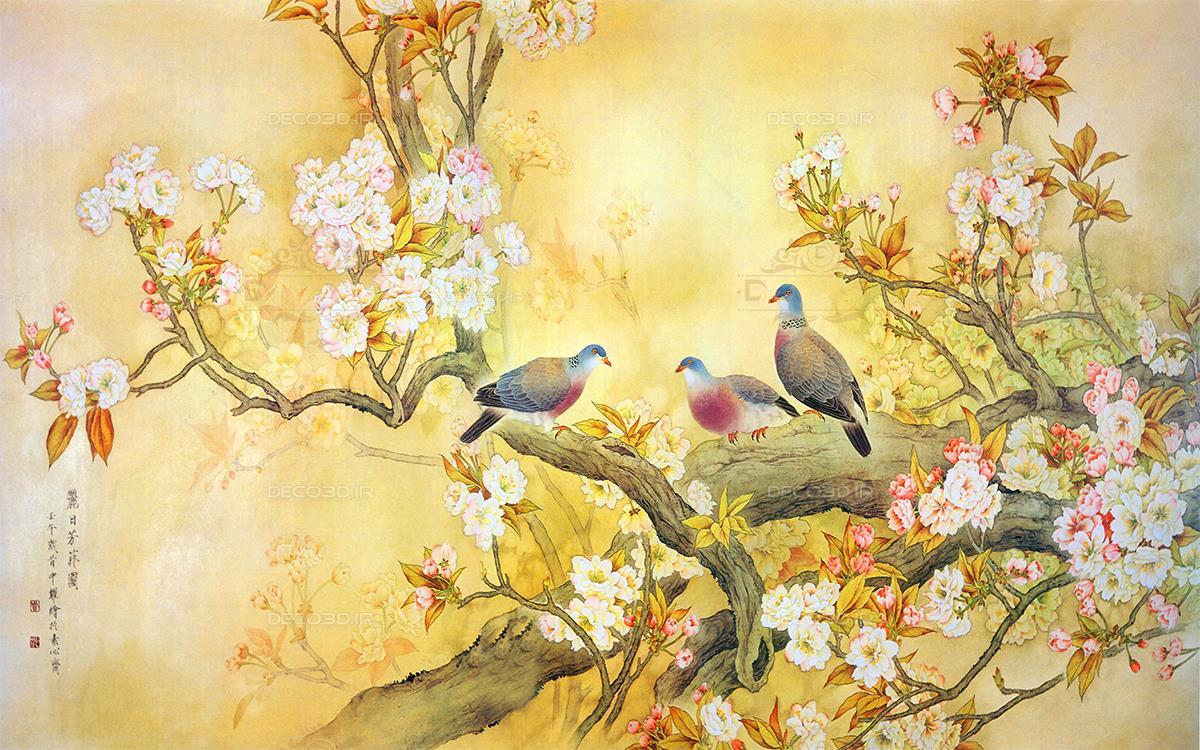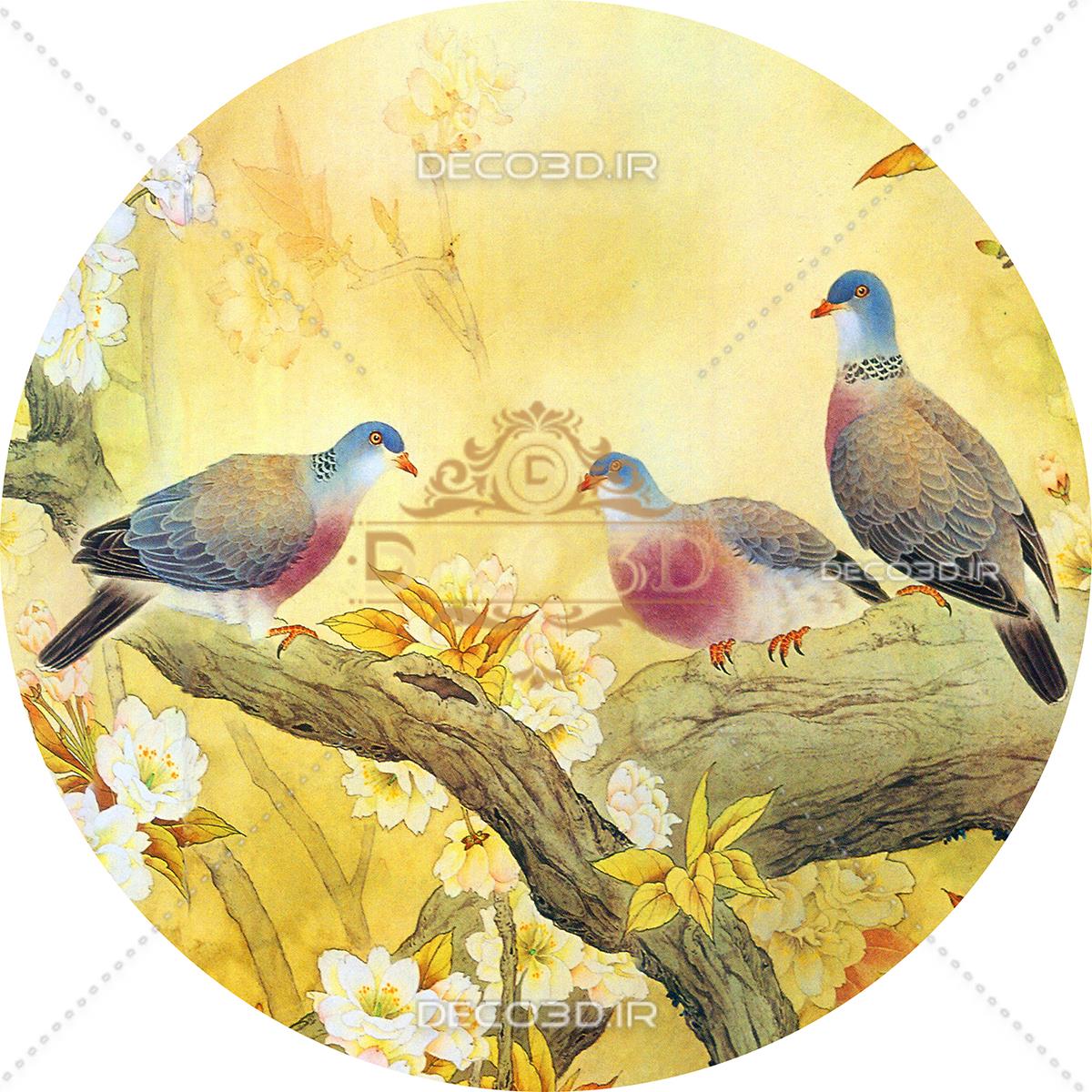 کبوترها بر روی شاخه درخت بهاری