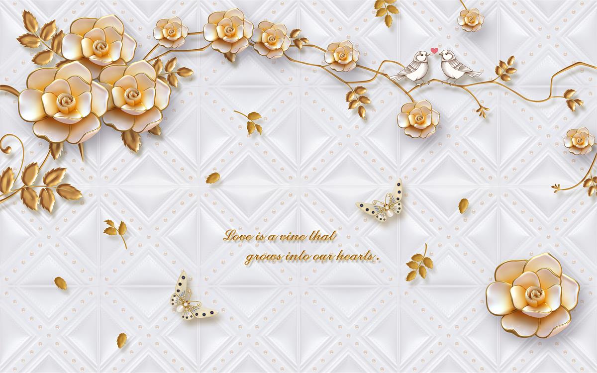 پس زمینه صورتی سه بعدی با گل وپروانه های سفید و طلایی برجسته