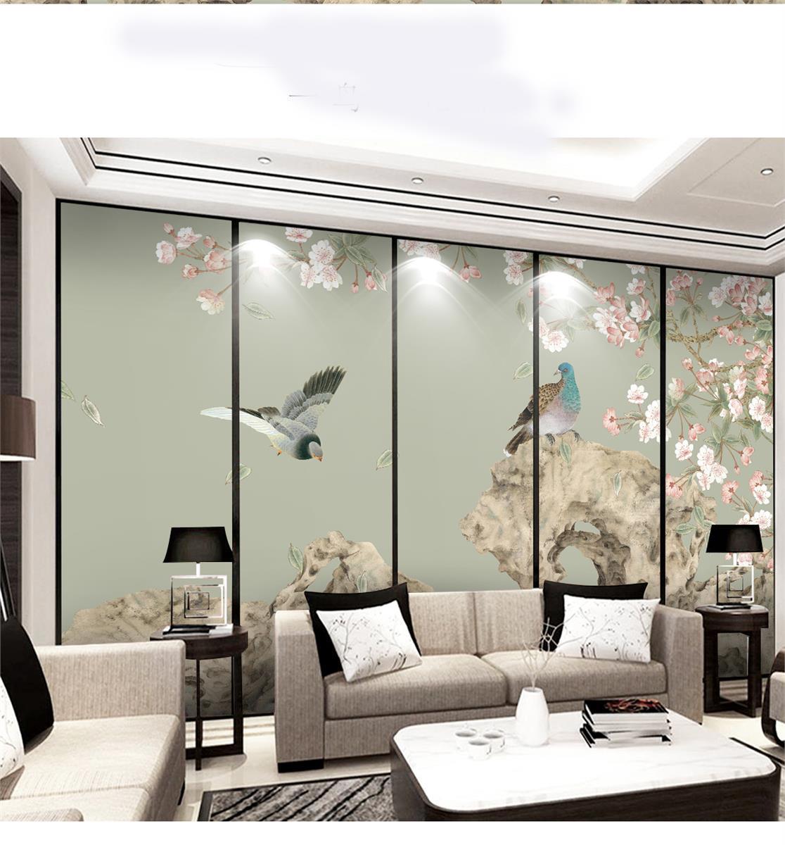 پس زمینه درختان بلند و پرنده ها