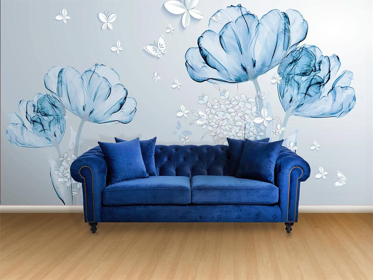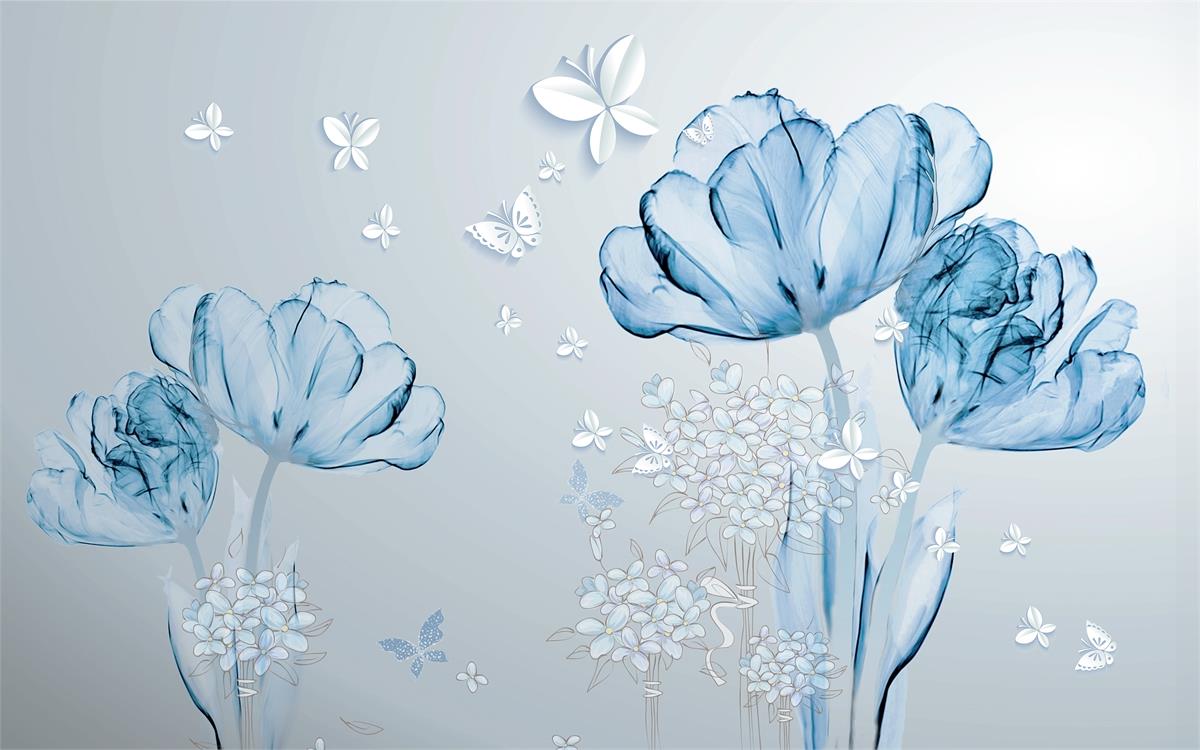 گلهای شفاف آبی و پروانه ها