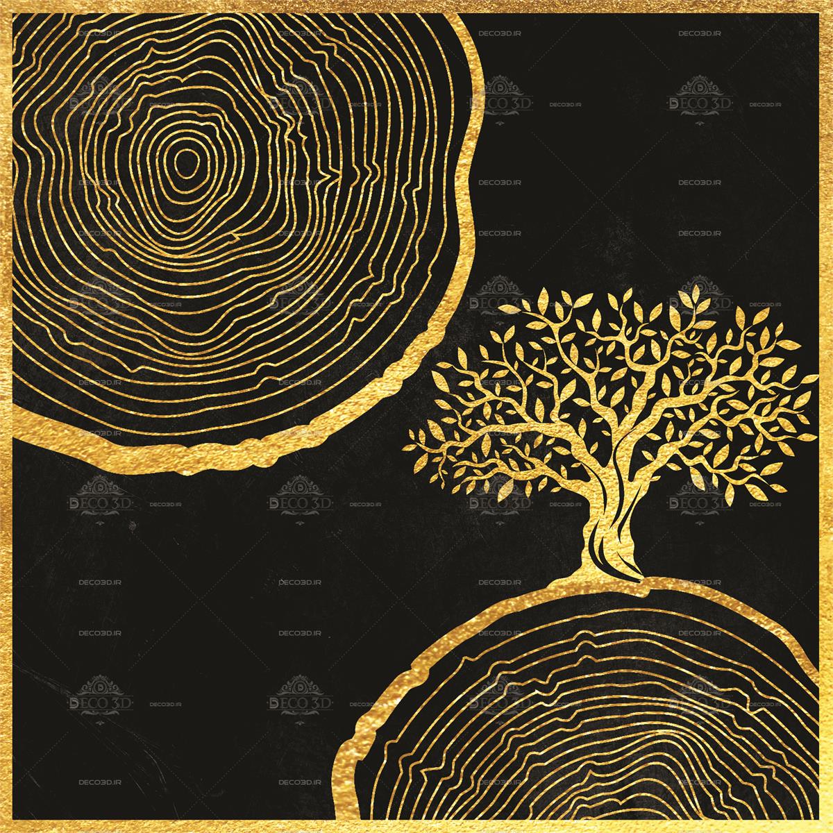 خطوط طلایی بر زمینه سیاه ، درختی که ریشه اش زمین و برگ افشانی می کند و خورشیدی که درخت را نمی سوزاند بلکه از نور سیراب می کند