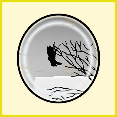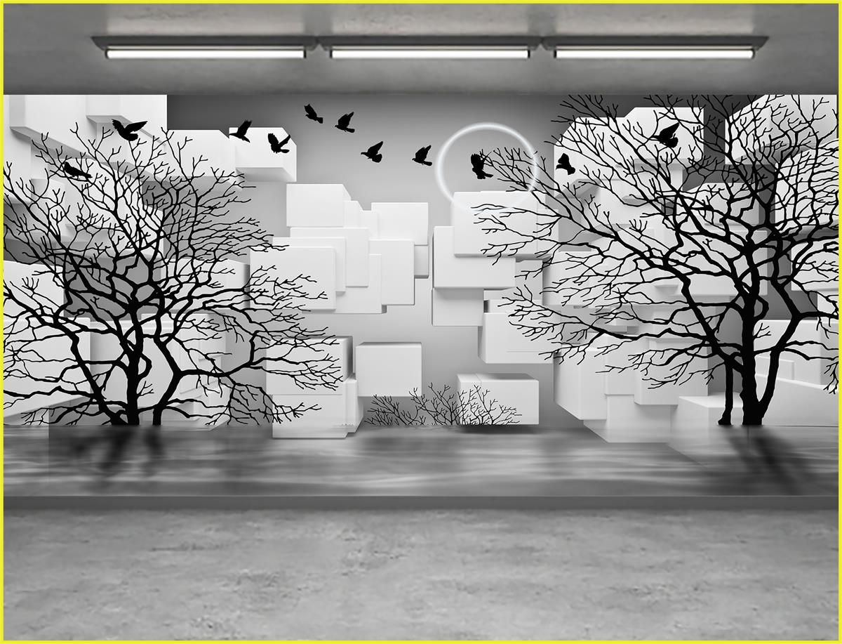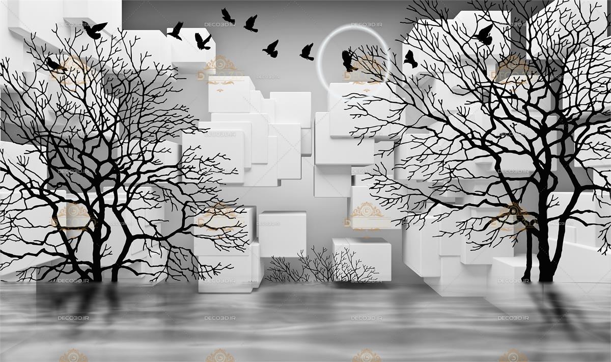 بازی پرندگان در بین درختان عریان در فضای مکعب های مربعی