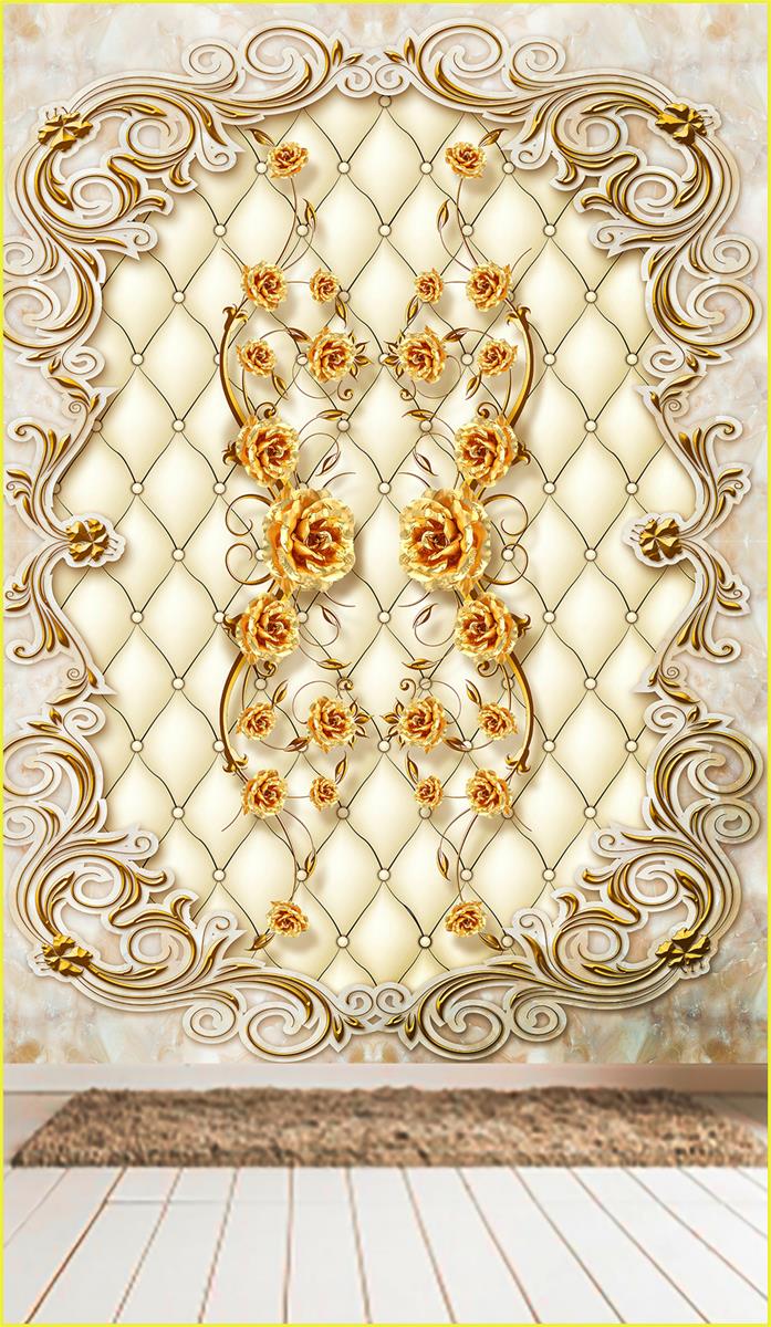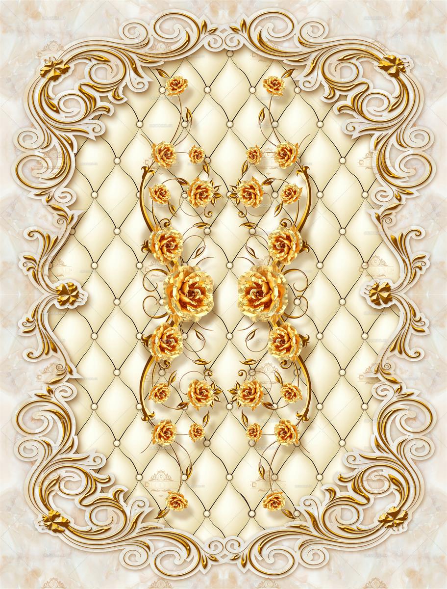 طرح سه بعدی دیواری با برگ و مربع های طلایی