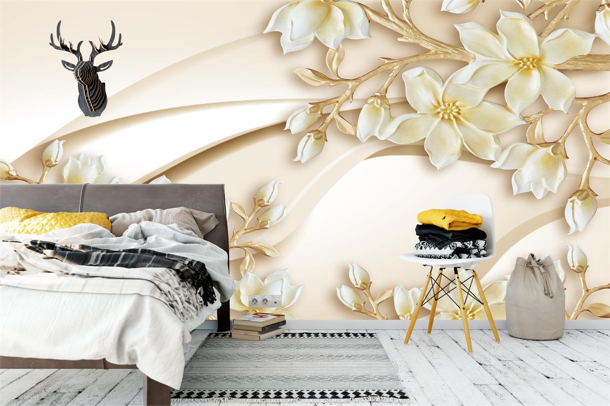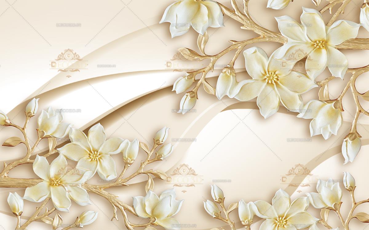 طرح سه بعدی دیواری با برگ و مربع های طلایی