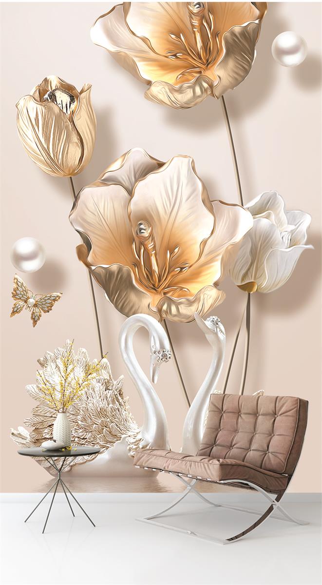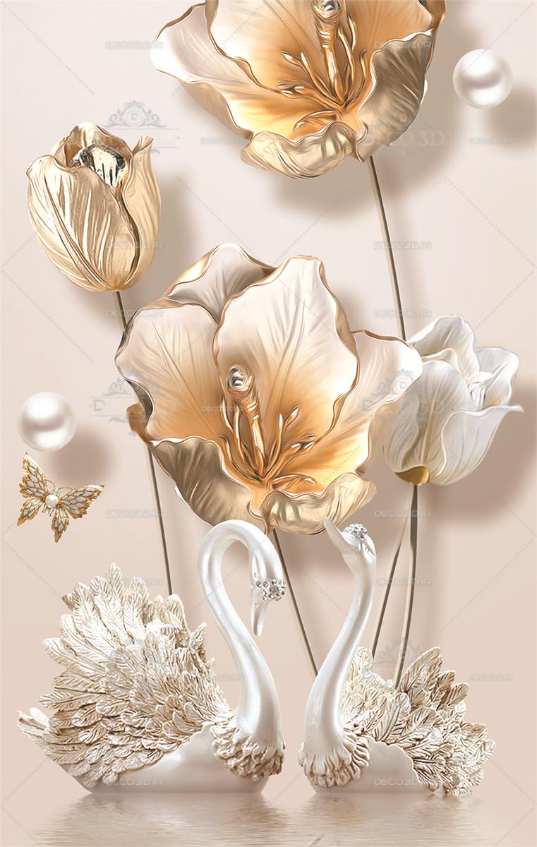 گلهای طلایی با غنچه های طلایی و قو ها