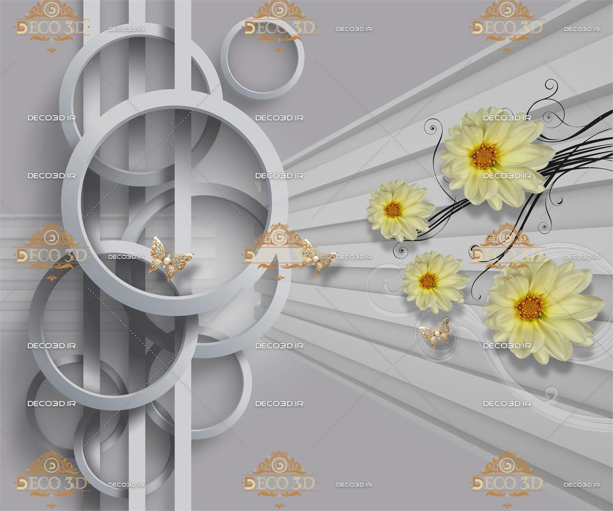 پس زمینه سفید سه بعدی با گل و پروانه های سفید و طلایی برجسته