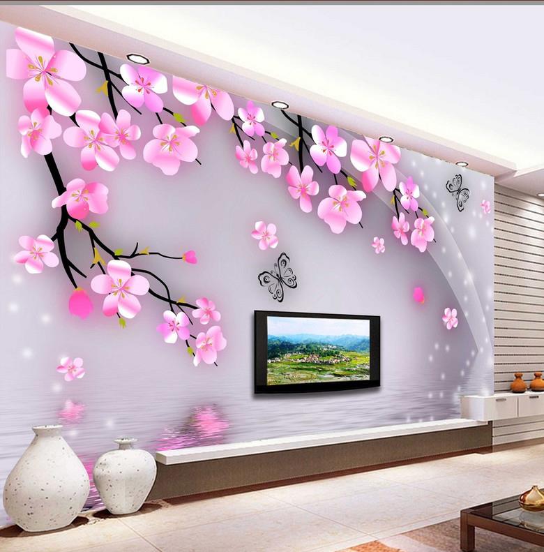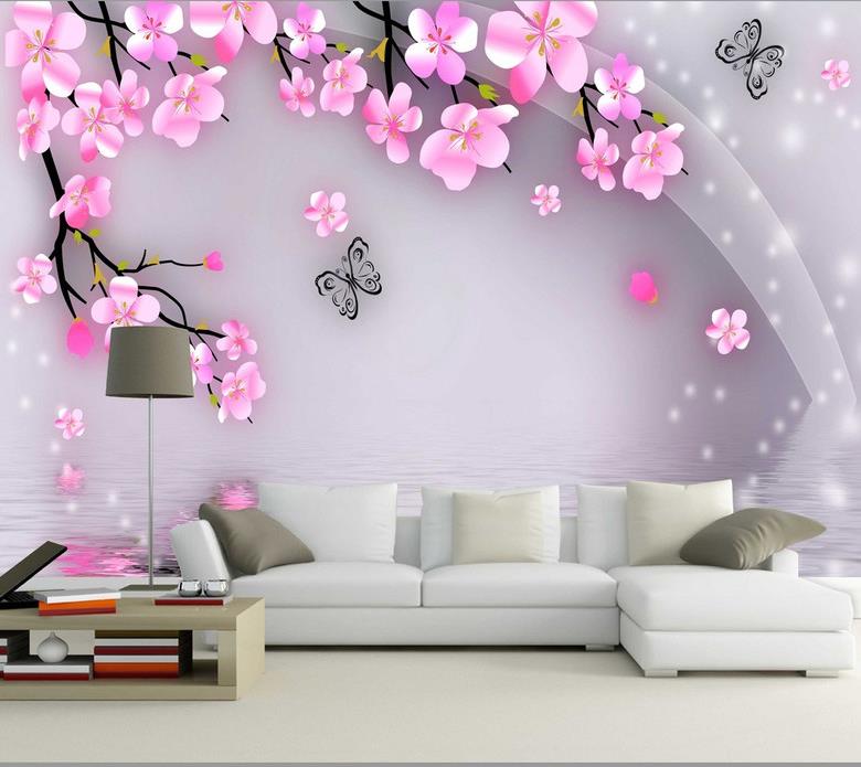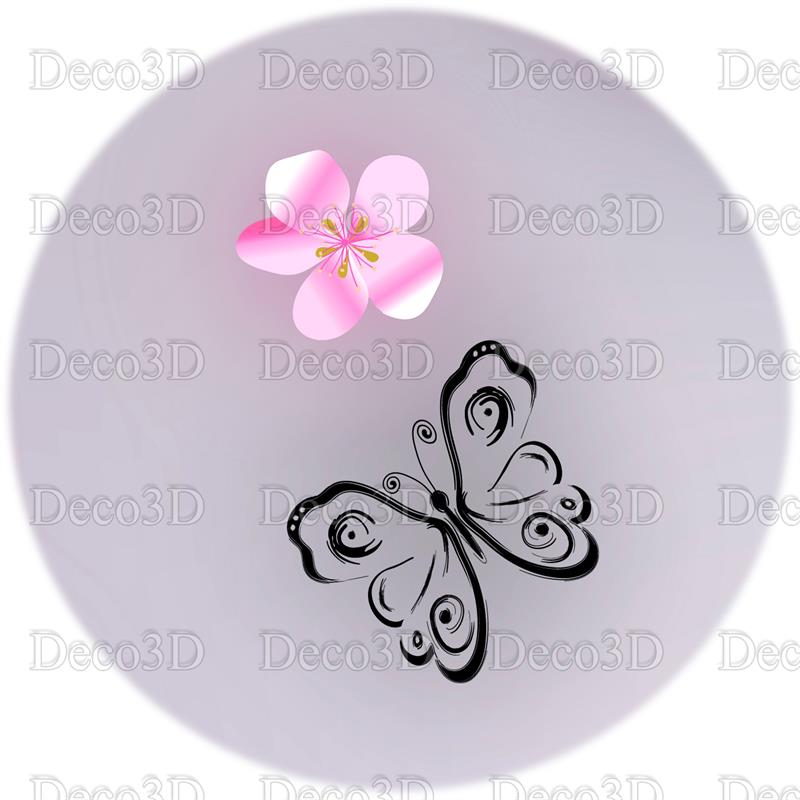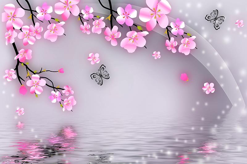 گلهای پنج پر صورتی و پروانه با زمینه آب