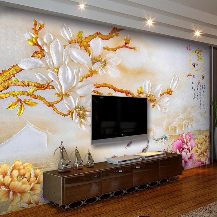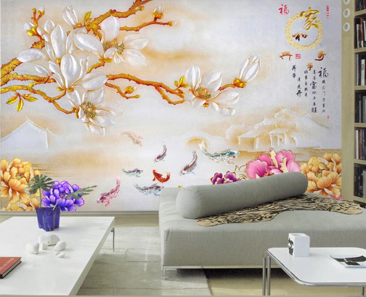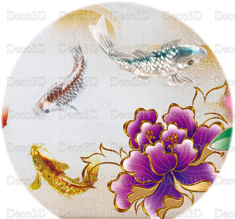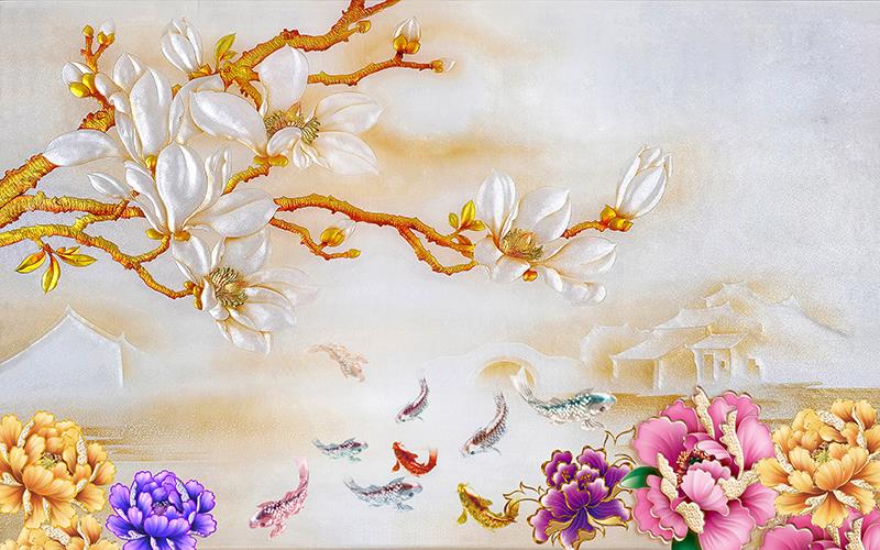 شاخه طلایی با گلهای سفید و ماهی قرمز