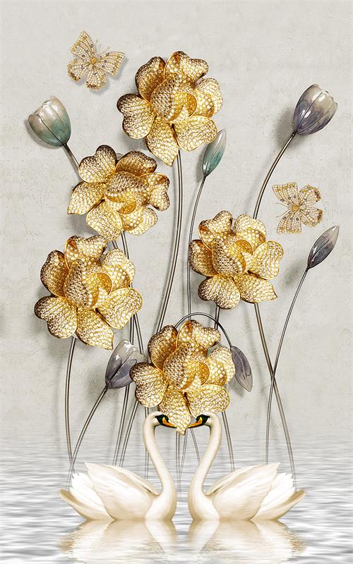 گلهای طلایی با غنچه های طلایی و قو ها