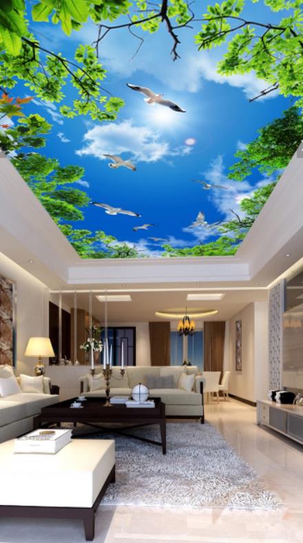پرندگان در حال پرواز میان درختان با پس زمینه آسمان