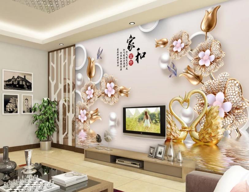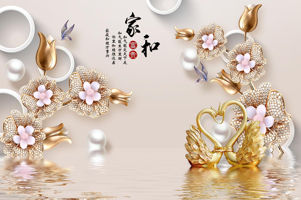 گل ها و قوهای طلایی در دریاچه با حروف شرقی