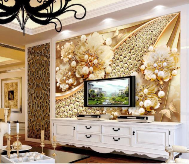 گل ها و پروانه های طلایی با زمینه منحنی مرواریدی