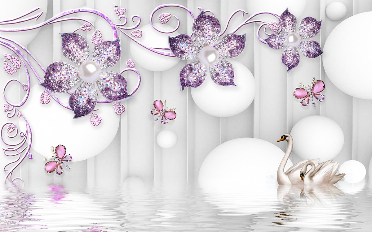 گل های پنج پر پنفش با پروانه ها و قوها با زمینه سفید کروی