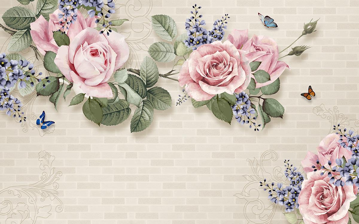 گل های گلبهی با برگ های سبز و پروانه ها با زمینه آجری