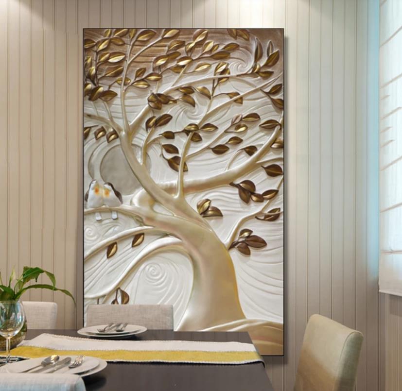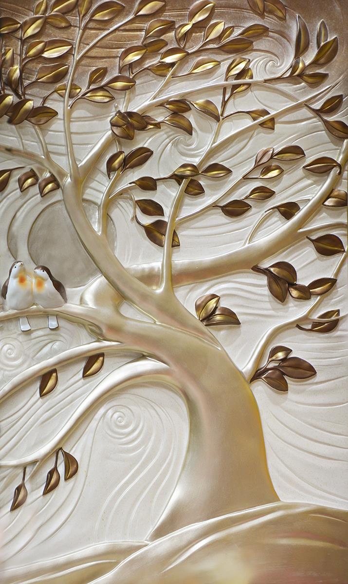 درخت پر پیچ و خم طلایی و پرندگان 3 بعدی