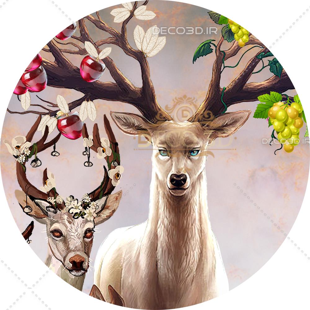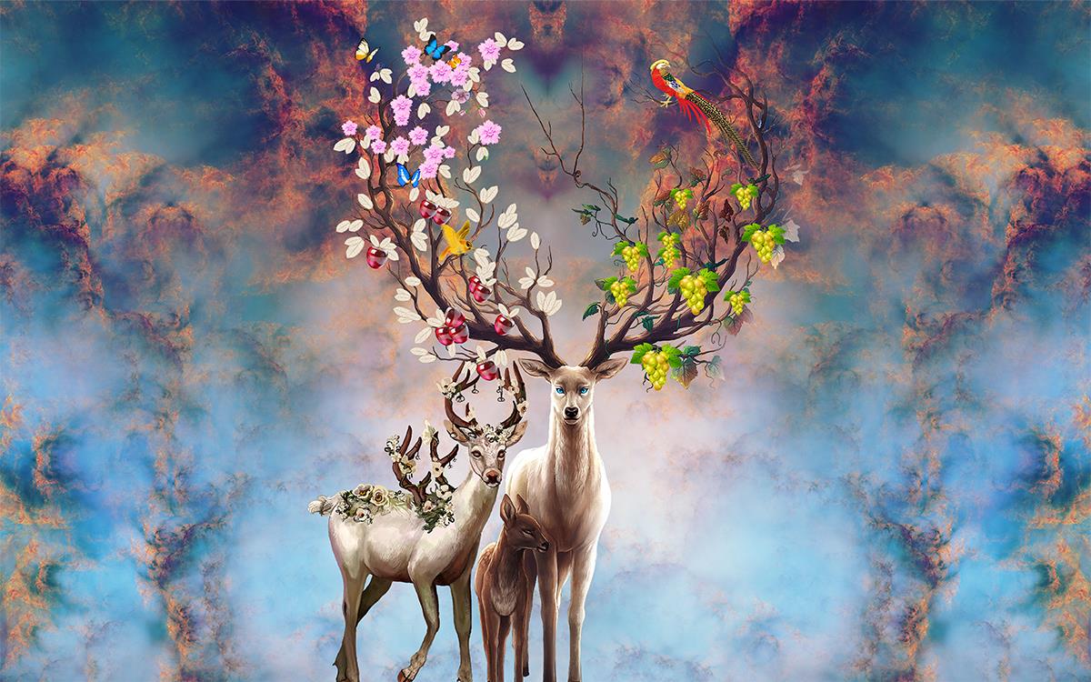 گوزن ها با شاخ گل دار و زمینه مه آلود