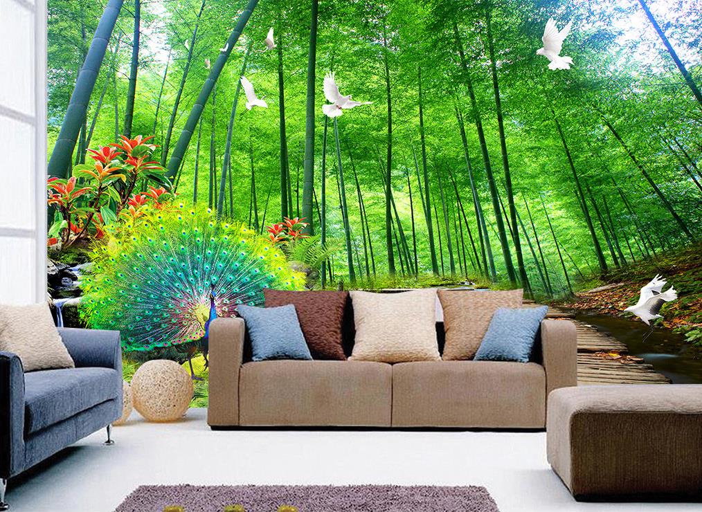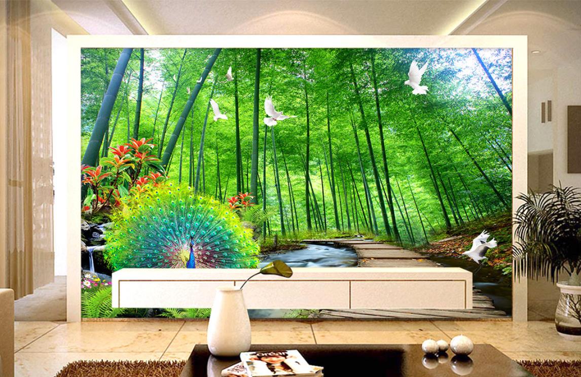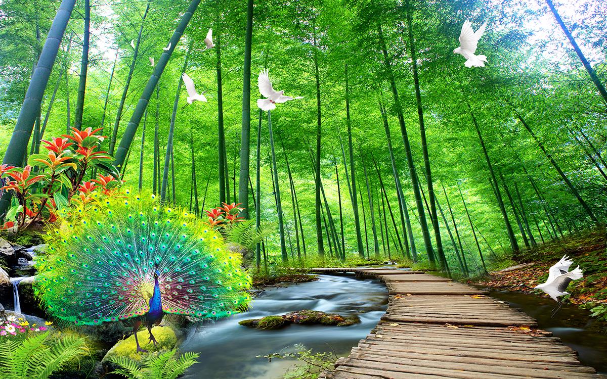 جنگل سرسبز با جوی آب و پرندگان