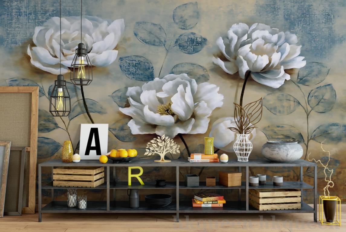 گل های سفید با برگ های آبی