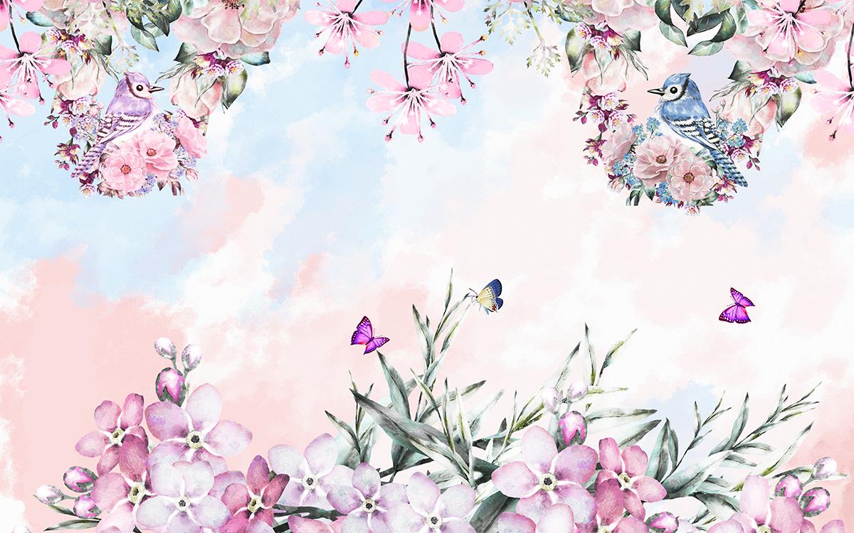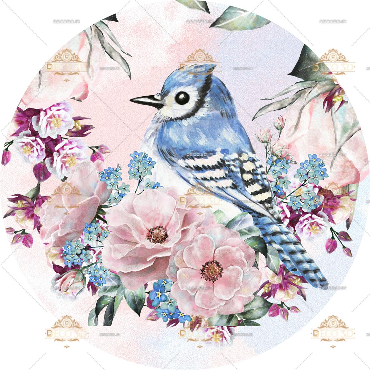 آسمان آبی آفتابی و پرنده و شاخه شکوفه دار