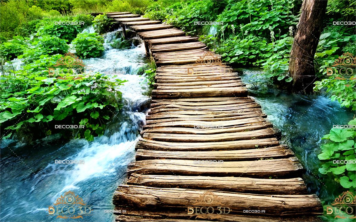 مسیر سرسبز آبی با پل چوبی
