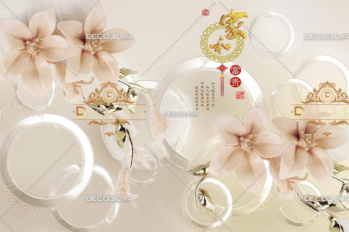 پس زمینه صورتی سه بعدی با گل وپروانه های سفید و طلایی برجسته