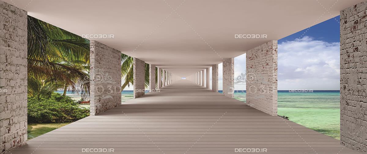 دالان مکعبی طولانی با منظره ساحل و دریا