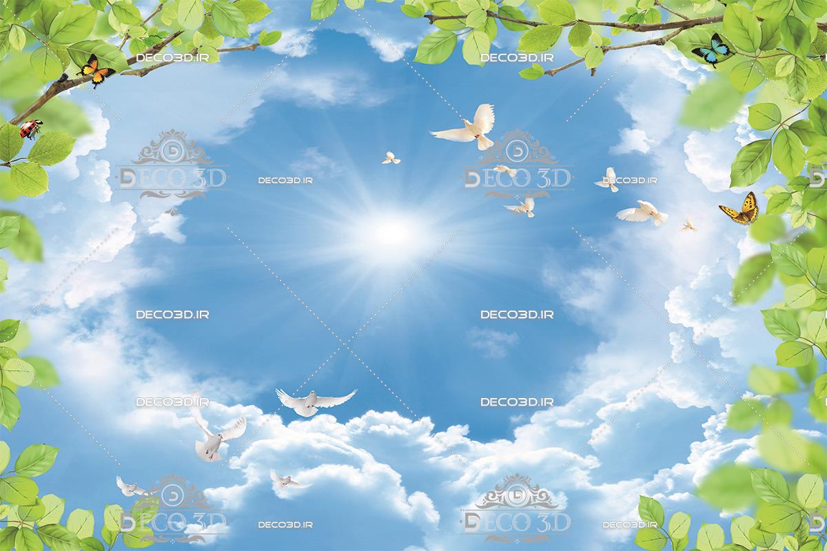 آسمان روشن با درختان سبز و پرنده ها