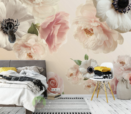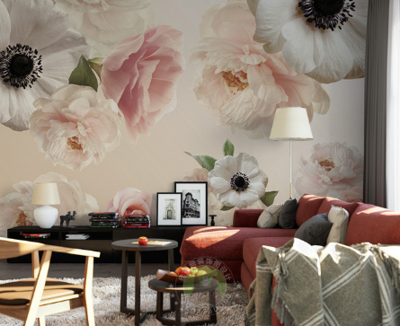گلهای گلبهی و پروانه های قرمز با زمینه مرمری