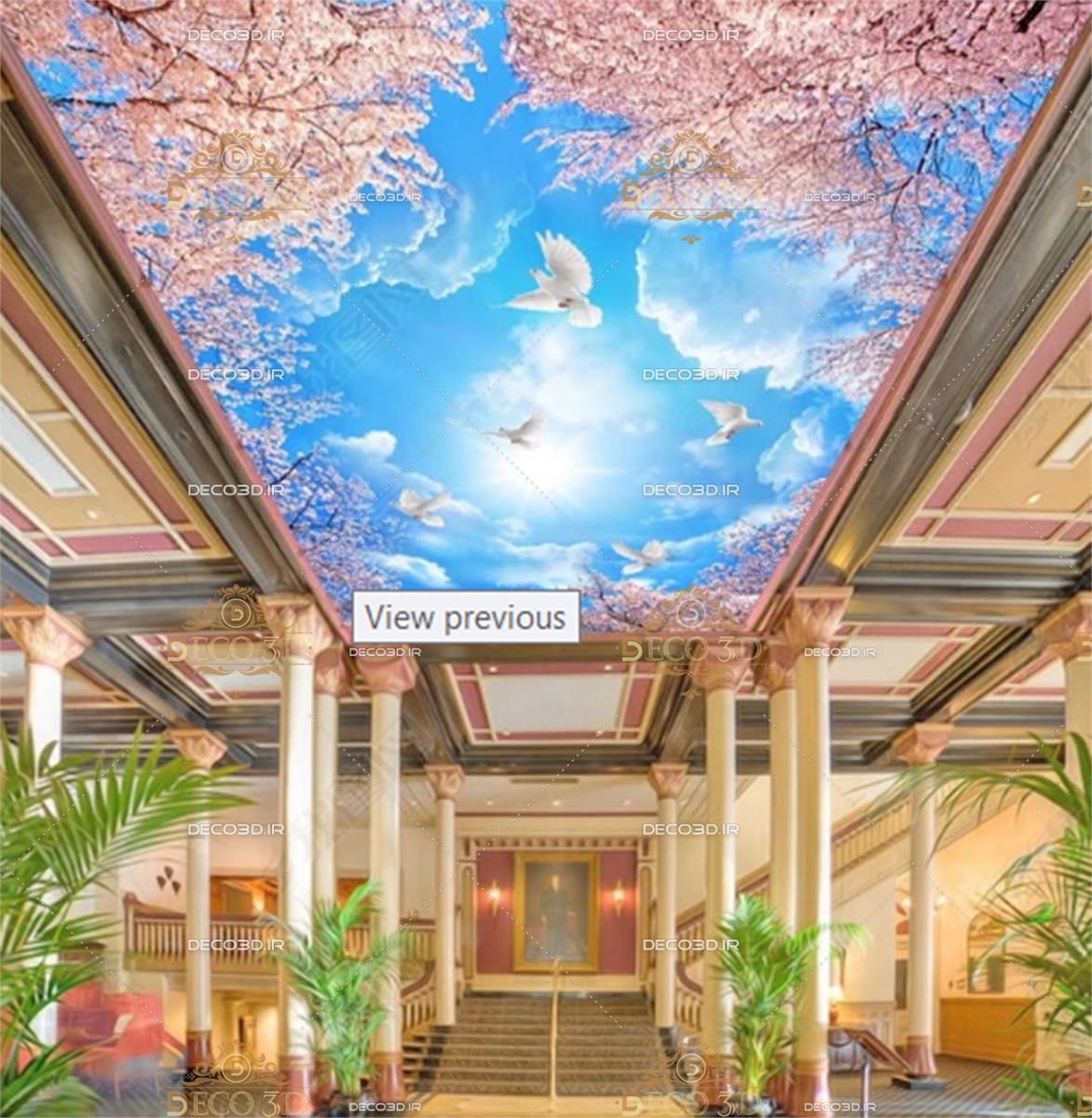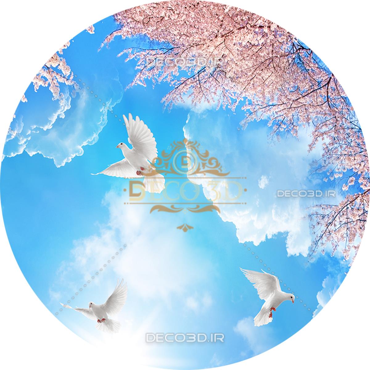 آسمان آبی با شکوفه های صورتی و کبوترها