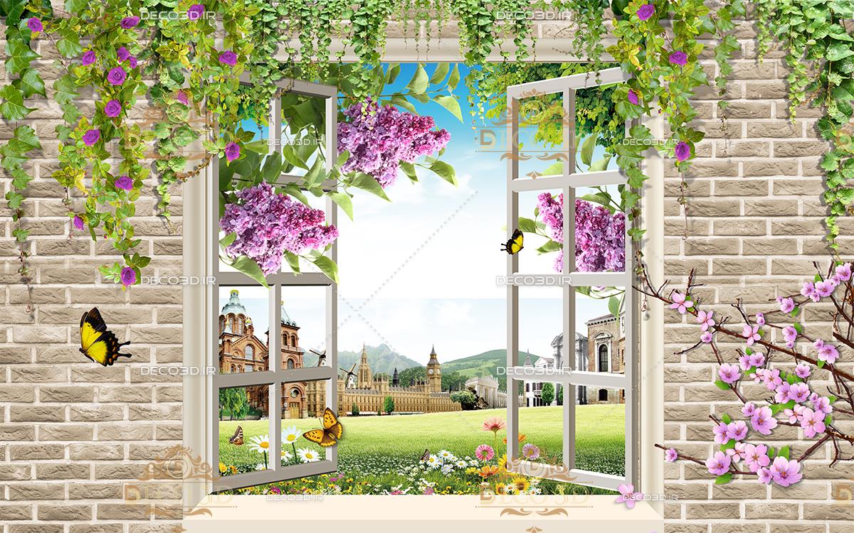 پنجره با گل های صورتی رو به طبیعت