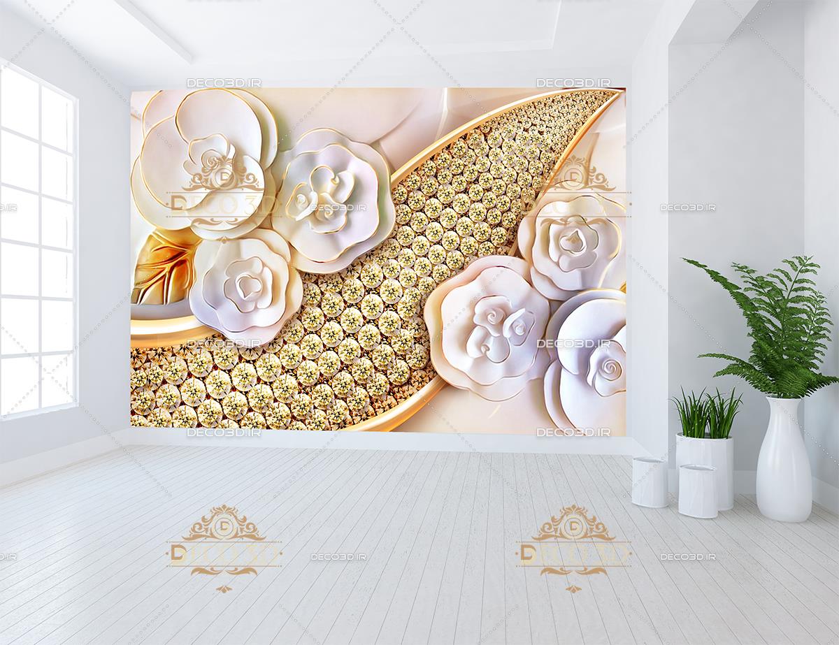 گلهای دور طلایی با زمینه کاغذ دیواری