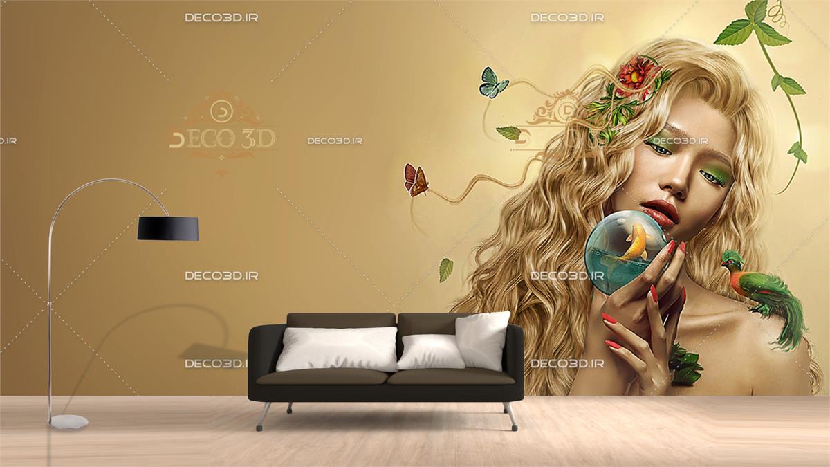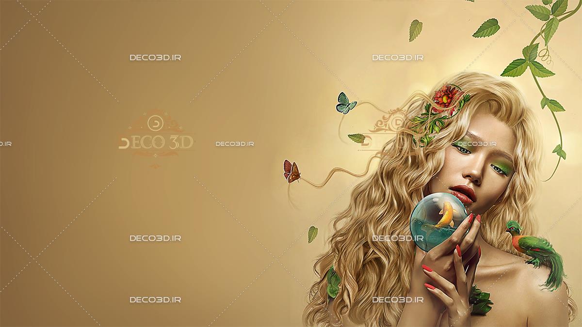 دختر زیبا با پرنده و پروانه ها و ماهی