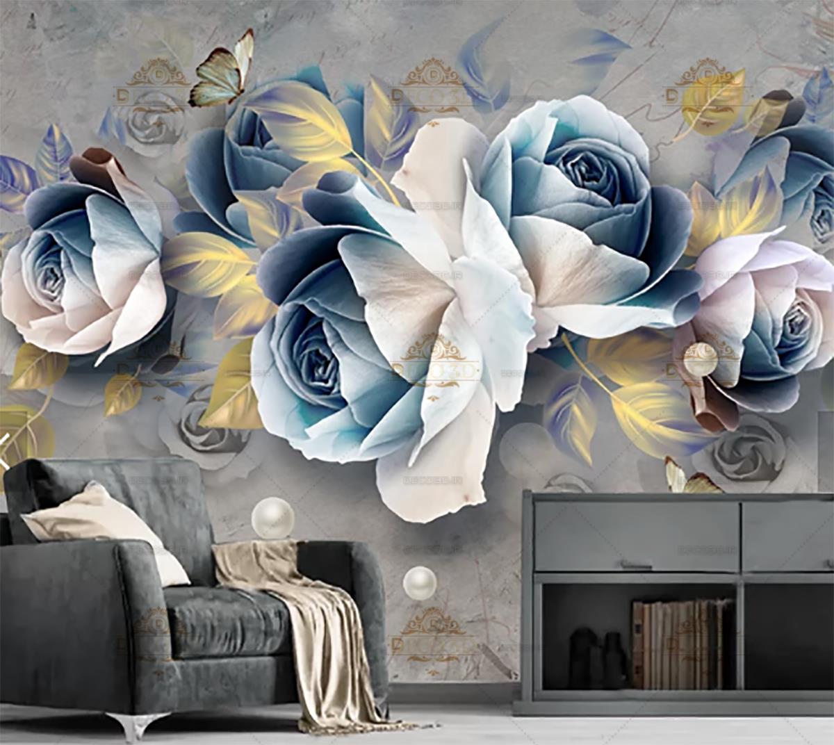 گلهای رز سفید و آبی و پروانه های زیبا