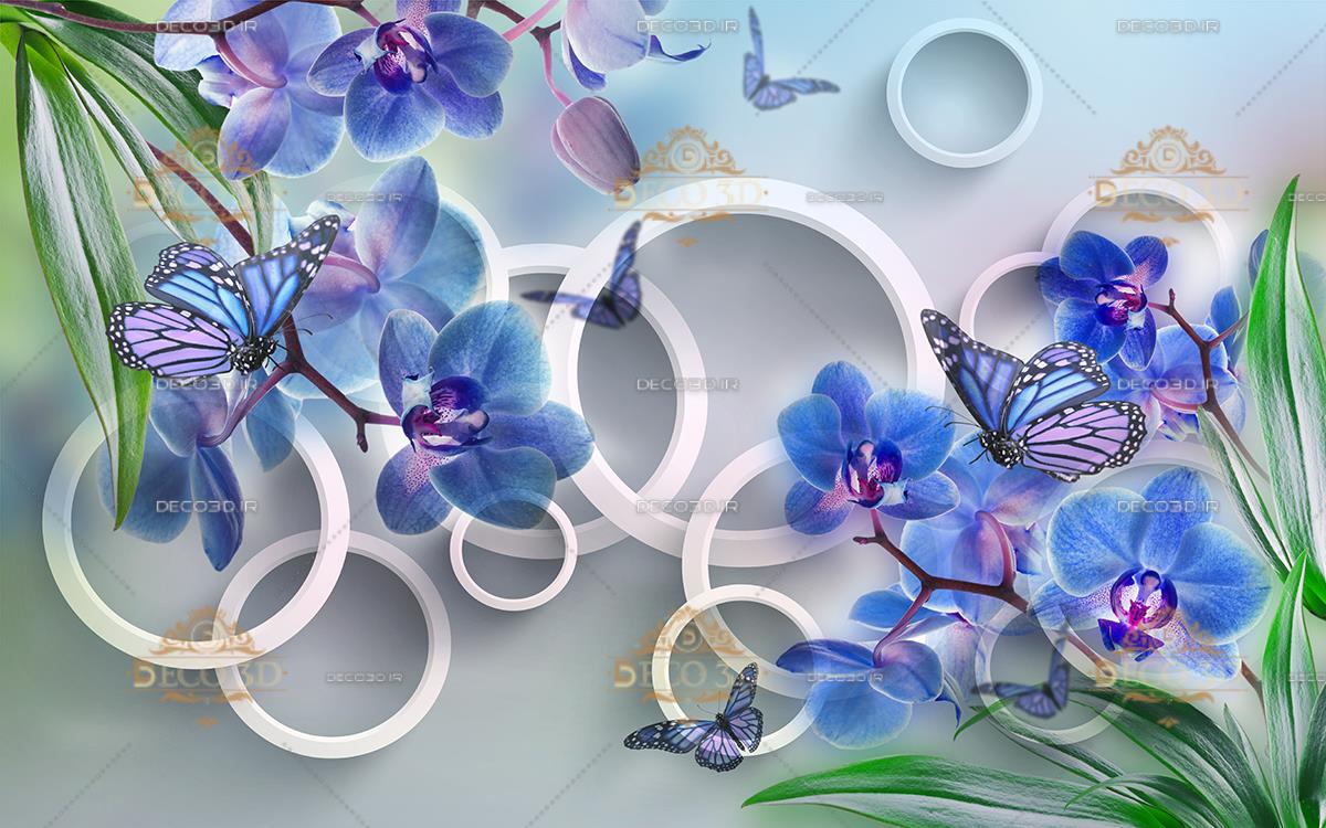 پروانه ها و گلهای آبی میان برگهای سبز