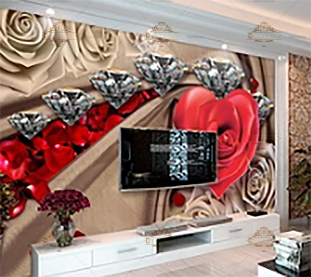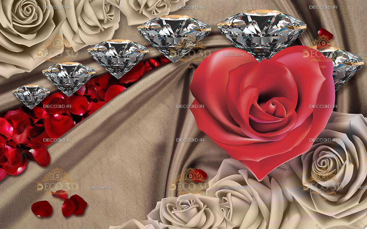 گل رز قرمز به شکل قلب و الماس ها