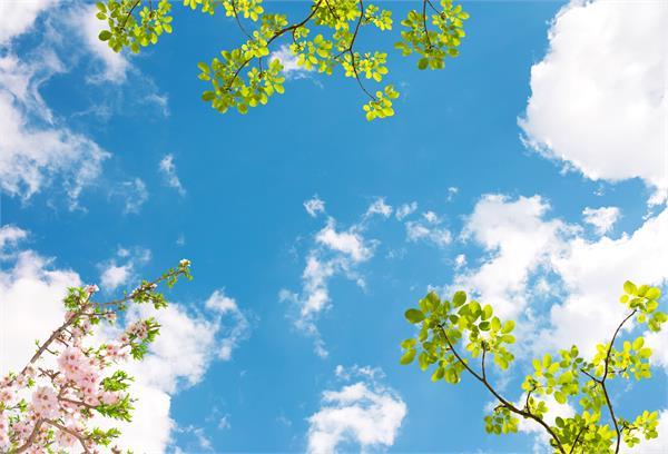 آسمان آبی همراه با شکوفه های بهاری سفید وصورتی