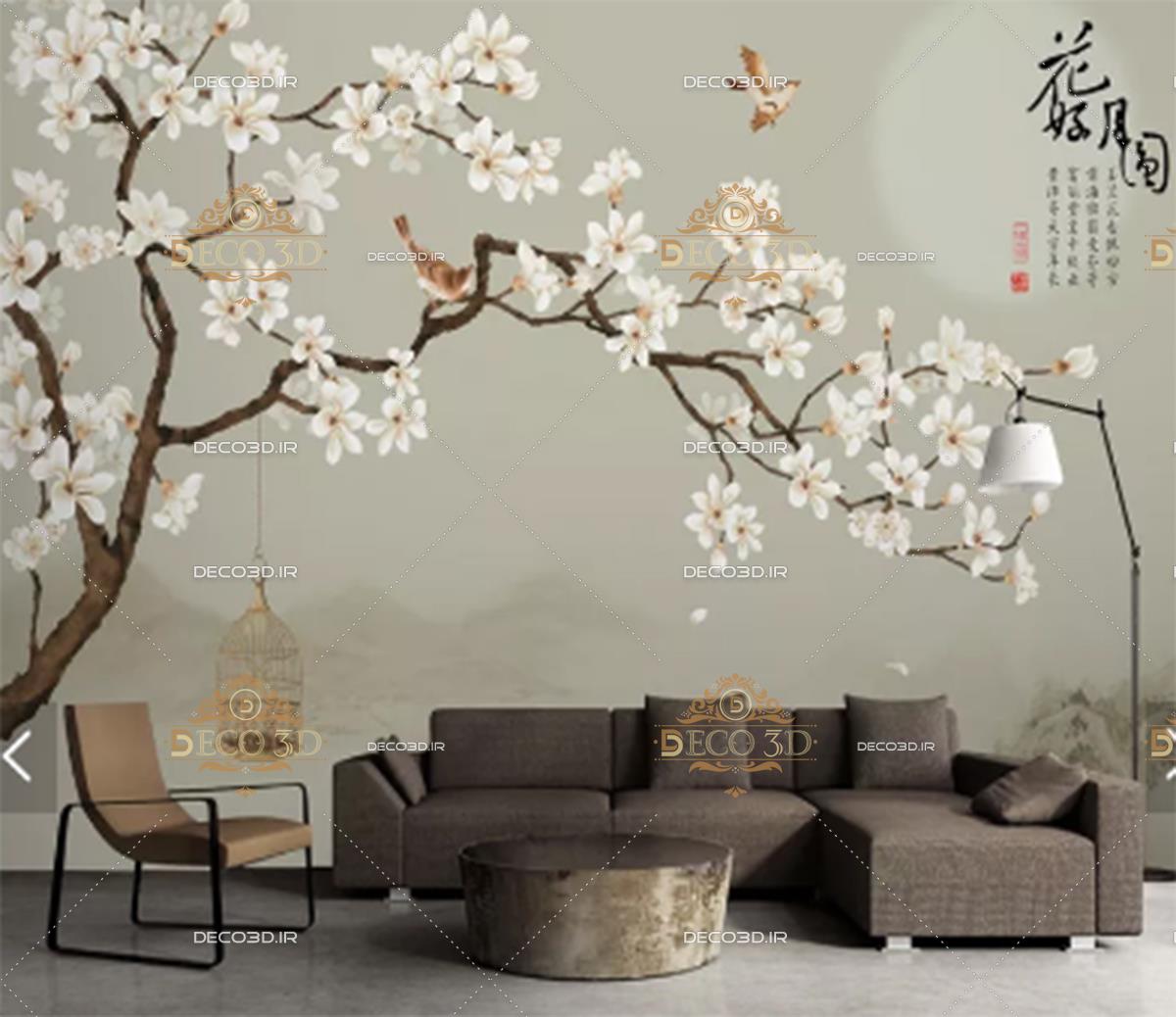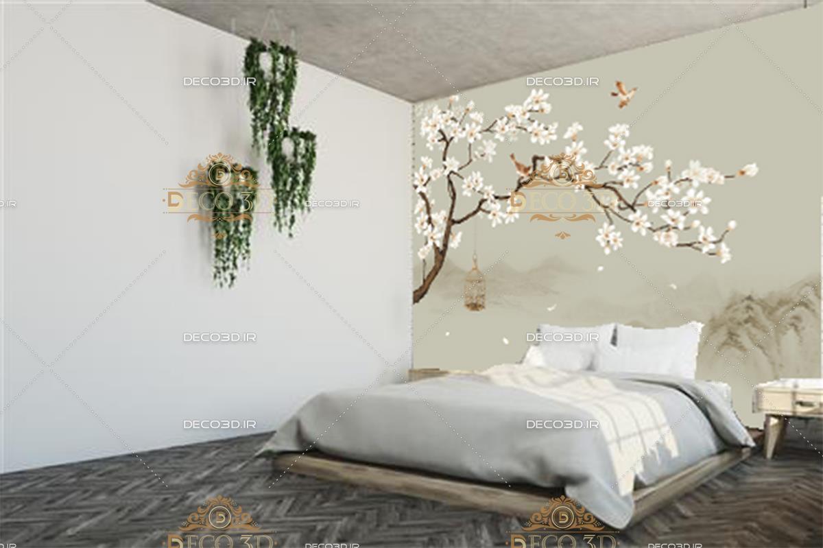 درخت با شکوفه های سفید و پرنده ها و قفس