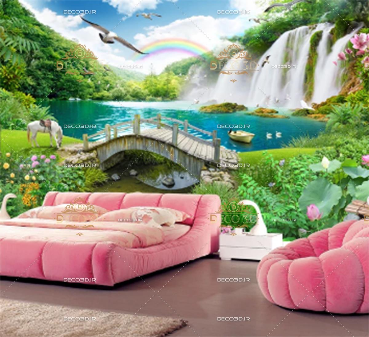 منظره آبشار در جنگل سرسبز با پرندگان و اسب