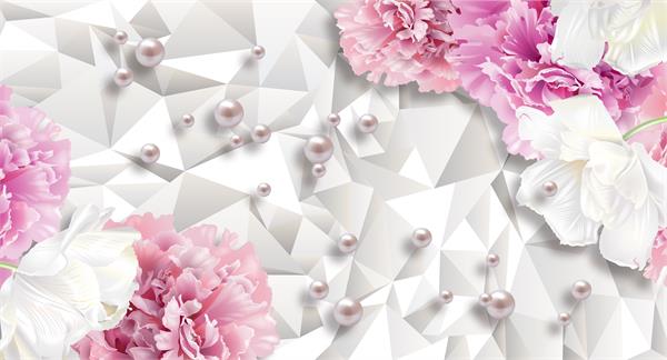 پس زمینه سه بعدی با مروارید و گلهای برجسته سفید و صورتی