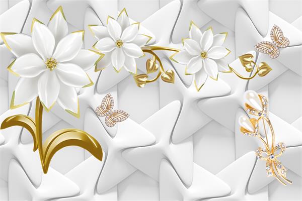 پس زمینه سفید سه بعدی با گل و پروانه های سفید و طلایی برجسته