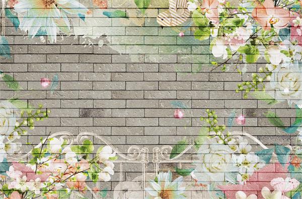 پس زمینه آجر و گلهای سفید و صورتی