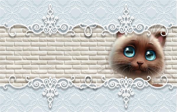 پس زمینه آجری و نقوش سفید با گربه برجسته کودکانه